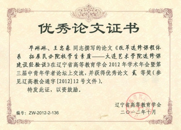 2、2012年10月,毕琳琳、王忠森,论文《改革选修课程体系 拓展民办院校学生素质》获得辽宁省高等教育学会优秀论文二等奖。