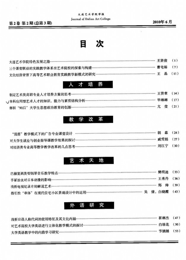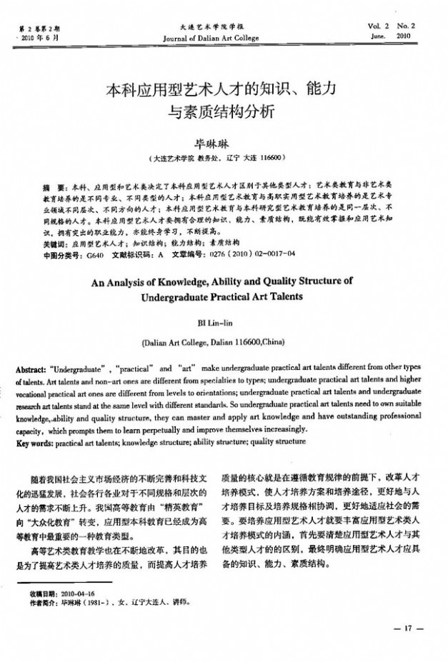 6、毕琳琳,本科应用型艺术人才的知识、能力与素质结构分析,《tyc1286太阳成集团学报》2010年第2期(2010年6月)。