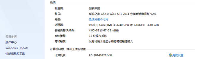 桌面右键点击“计算机”图标,选择“属性”,出现如下界面,红色框部分为操作系统类型(例:如下图为Win7 32位操作系统)