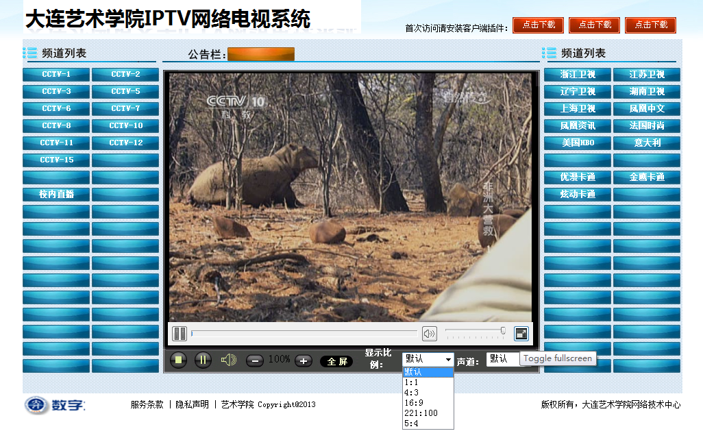 打开浏览器(目前测试可用浏览器为IE 8及360浏览器),输入网址:iptv.dac.edu.cn进入界面。